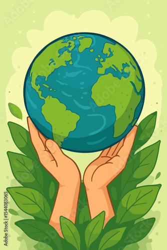 Vector cartoon of hands holding planet Earth globe surrounded by green leaves. Concept for Earth Day, conservation, sustainability, ecology and environmental protection. Save our planet.