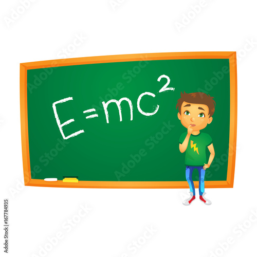 vector cartoon school boy stands near big chalk blackboard with physical energy formula. Flat isolated illustration on a white background. Back to school concept
