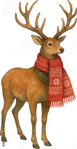 Vector Charming reindeer wearing a red winter scarf with a Nordic pattern. Vintage-style Christmas illustration perfect for seasonal cards, winter decor, and festive holiday designs.