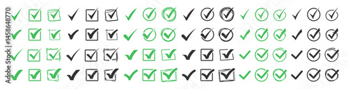 Vector Checkmark Icons Collection. Hand Drawn Green and Black Ticks in Boxes and Circles, Doodle Style Approval Symbols