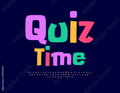 Vector Children logo Quiz Time. Joyful Festival Font. Bright Kids Alphabet Letters and Numbers