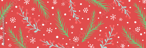 Vector Christmas background with hand drawn spruce branches, berries and snowflakes. Long horizontal banner