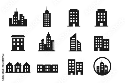 Vector city building icon set. Real estate silhouette collection. Skyscraper, office, and house symbols for architecture and construction. Urban property pictogram graphic design.