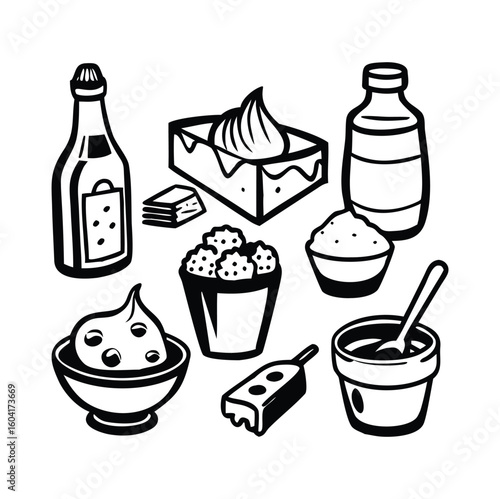 Vector collection of dairy products in flat style including milk, butter, cheese, yogurt, cottage cheese, sour cream, ice cream, cream, isolated on white