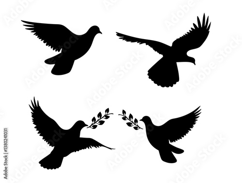 Vector collection of peaceful doves with olive branches, simple and classic design isolated on white background