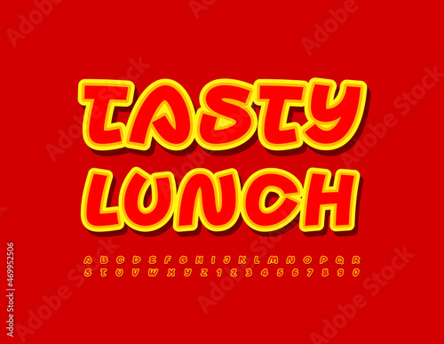 Vector colorful Banner Tasty Lunch. Red and Yellow Font. Modern Bright Alphabet Letters and Numbers