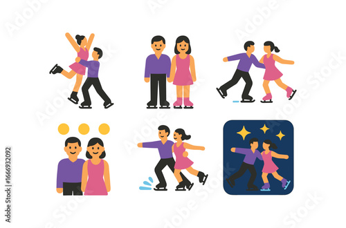 vector colorful flat filled icons ice dancing (pair): elegant lift matching costumes glide smiles bright lights ice spray.