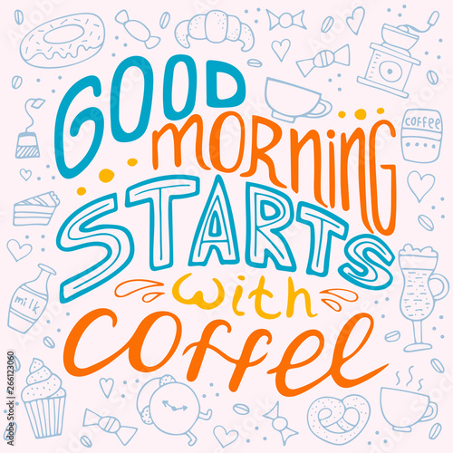 Vector conceptual illustration with doodles. Good morning starts with coffee.