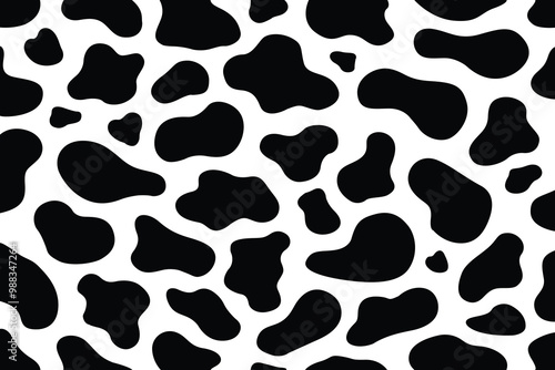 Vector cow print pattern background. Black irregular patches on white backdrop. Abstract cows skin texture illustration. Hand drawn design. Farm animal print