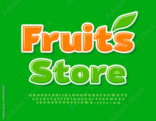 Vector creative emblem Fruits Store. Green Glossy Font. Artistic Alphabet Letters and Numbers