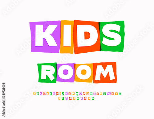 Vector Creative emblem Kids Room. Bright Joyful Font. Colorful Alphabet Letters, Numbers and Symbols.