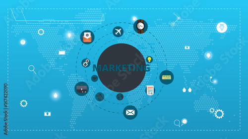 Vector creative illustration of marketing , tag cloud on blue background. Marketing technology concept. Thin line art style design for promotion, social media