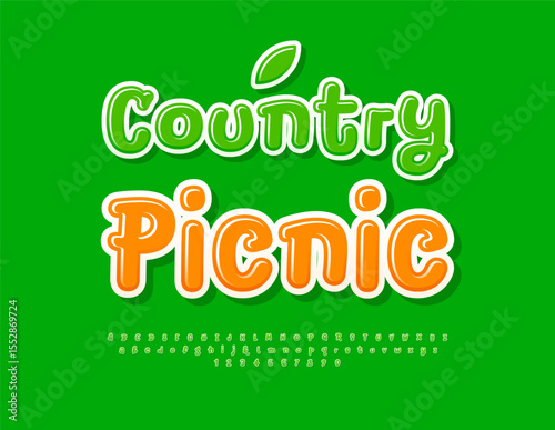 Vector Creative logo Country Picnic. Glossy Green Font. Playful Digital Alphabet Letters and Numbers set.