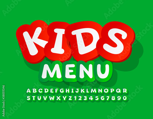 Vector creative template Kids Menu. Sticker style Font. Green Playful Alphabet Letters and Numbers set