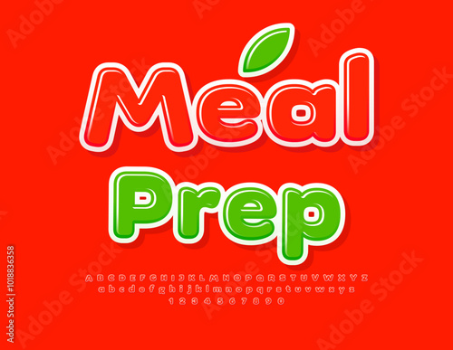 Vector creative template Meal Prep. Glossy Red Font. Modern Alphabet Letters and Numbers set.