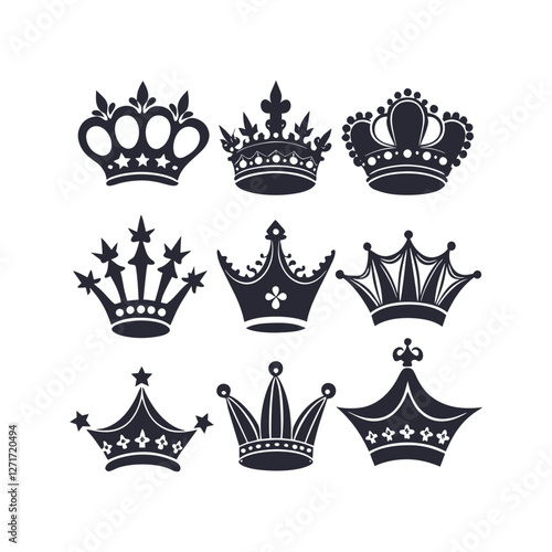"Vector Crown Icons Set - King and Princess Crown Silhouettes, Symbol Collection, and Royal Vector Illustrations"