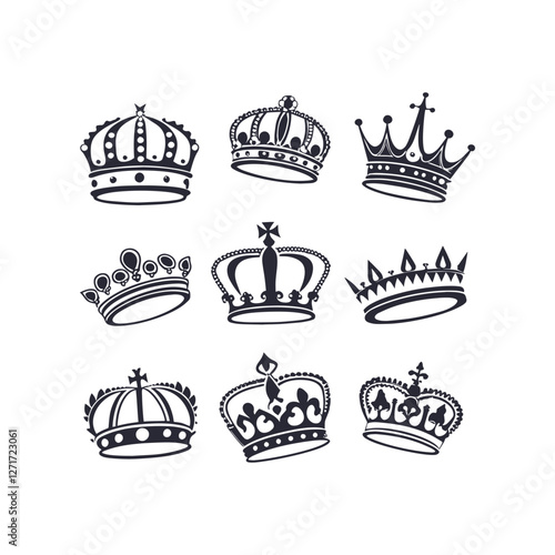 "Vector Crown Icons Set - King and Princess Crown Silhouettes, Symbol Collection, and Royal Vector Illustrations"