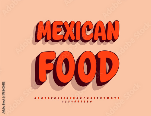 Vector Culinary sign Mexican Food. Creative Handwritten Font. Cool Red 3D Alphabet Letters and Numbers set.