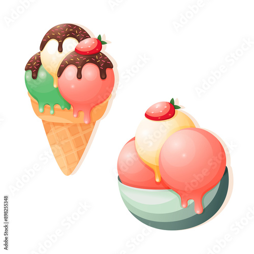 Vector cute cartoon ice cream with colorful cream balls and strawberry clipart design on a transparent background. Cute sweet food ice cream poster art design