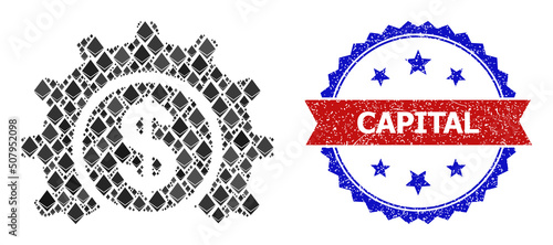 Vector diamond composition bank industry icon, and bicolor grunge Capital stamp. Red round stamp contains Capital caption inside circle. Bank industry mosaic is constructed with gem elements.