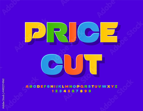 Vector Discount banner Price Cut. Modern Colorful Font. Bright Sticker Alphabet Letters and Numbers set.