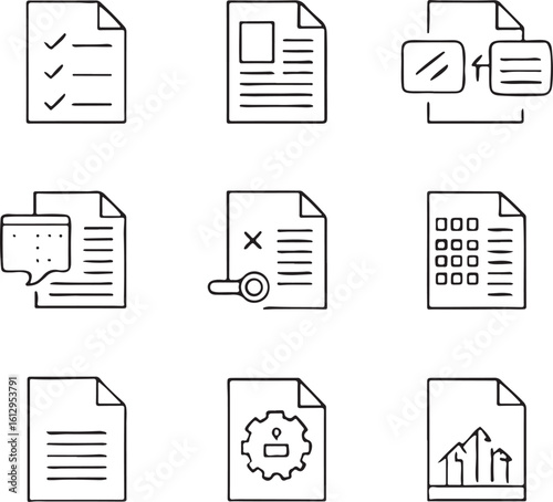 Vector document icon set: a black symbol for business files, web pages, office notes, and data contracts