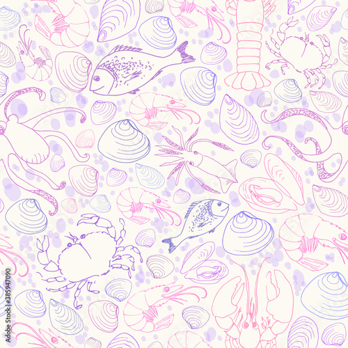 Vector doodle seafood seamless pattern in blue and purple colors.