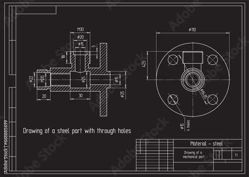 Vector drawing of a steel mechanical part with through holes. Engineering cad scheme. Mechanic background.
