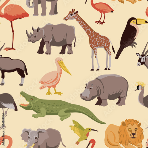 vector drawing seamless pattern with tropical animals and birds African background, hand drawn illustration