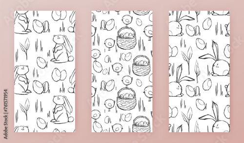 Vector Easter hand drawn seamless patterns set. Cute bunny signs. Funny cartoon rabbit. Little chickens, big eggs basket. Ink paint graphic backdrop. Flat contour art for packaging, advertising layout