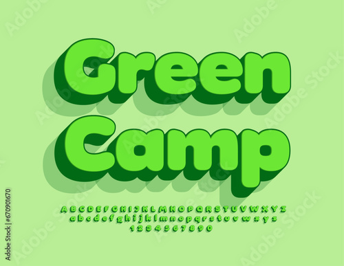 Vector eco concept Green Camp. Modern 3D Font. Artistic Alphabet Letters and Numbers set