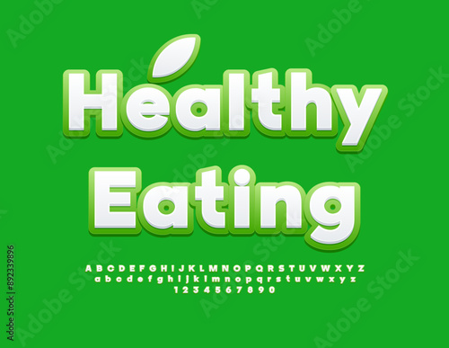 Vector ecologic badge Healthy Eating. White and Green Bright Font. Creative Alphabet Letters and Numbers set.
