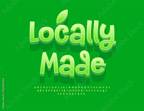 Vector Ecologic concept Locally Made. Green Handwritten Font. Artistic 3D Alphabet Letters and Numbers set.