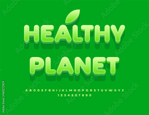 Vector ecological concept Healthy Planet. Green 3D Font. Cute Alphabet Letters and Numbers set.
