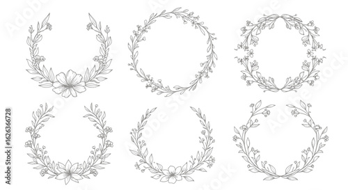 Vector Elegant Floral Wreath SVG Illustration Set with Line Art Style for Vintage Botanical Designs