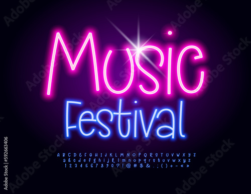 Vector event Banner Music Festival Artistic Neon Font. Glowing Alphabet Letters and Numbers set