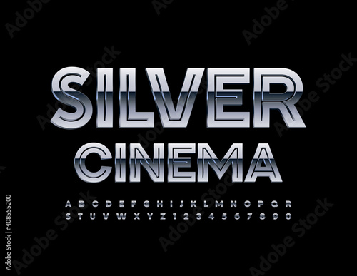 Vector event banner Silver Cinema. Glossy Metal Font. 3D Chrome Aphabet Letters and Numbers set