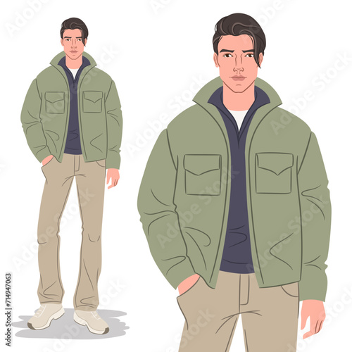 Vector fashion illustration of a handsome, young man in a winter outfit. Male fashion model posing in a stylish jacket.