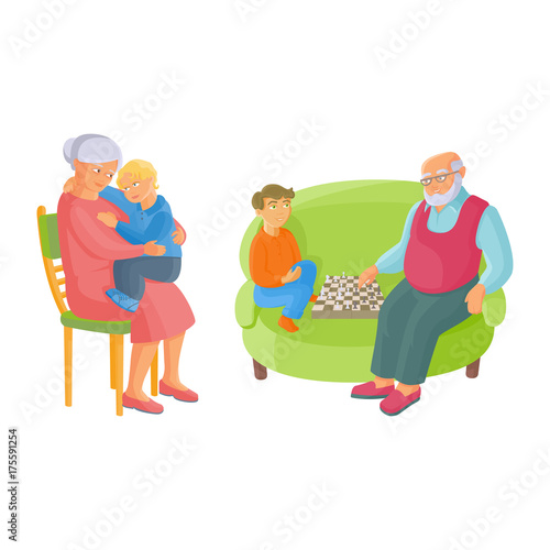 vector flat grandparents and children set. Grandfather and grandson playing chess at armchair. grandmother sitting with small boy at her knees at chair. Isolated illustration on a white background.
