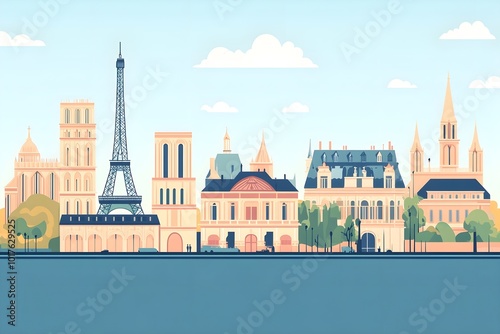 Vector flat illustration of the Paris city skyline, minimalistic design with bold lines and soft pastel colours, capturing the charm and elegance of the city