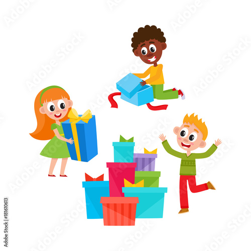 vector flat kids with presents. Young girl green dress holding present box with bright wrapping and bow near big pile of presents, african boy opening present box, caucasian child dancing isolated