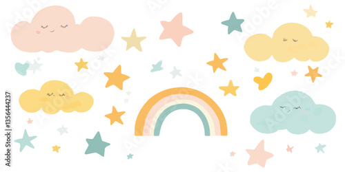 Vector flat pastel-colored clouds, rainbows, and stars set against a white background.