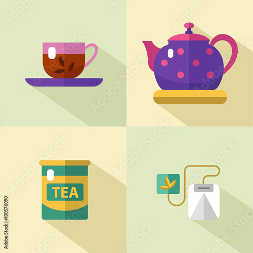 Vector flat style icons set of tea with long shadows. Cup, teapot, tea can, tea, tea bag. Tea time, tea leaves, tea tools. Tea time vector symbols.
