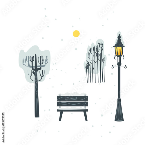 Vector flat urban landscape background design elements icon set. Streetlight, lamppost or lantern, street bench, stylized tree, bush and sun. Isolated illustration on a white background.