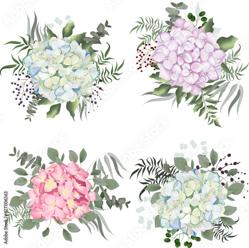 Vector floral arrangement on white background with gold elements and glitter. Blue, white and pink hydrangea, eucalyptus, gypsophila, green leaves and branches. Vector illustration