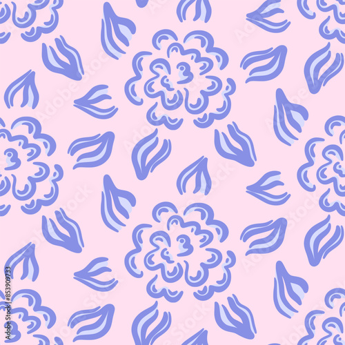 Vector floral seamless pattern. Abstract blue flowers with leaves in hand drawn style. Retro vibe. Cottage core. Design for fabric, wallpaper, wrapping paper, cover, poster, invitation