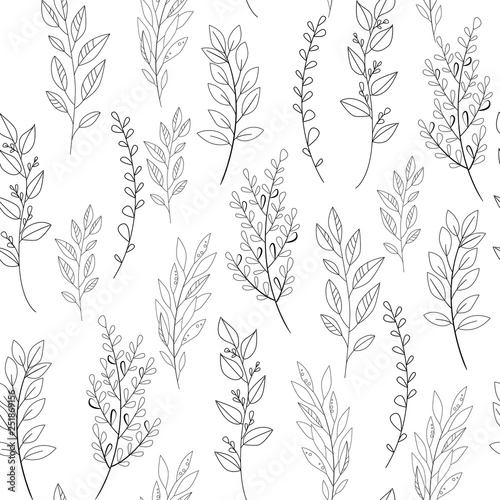 Vector flower black-white pattern. Seamless botanic texture, detailed flowers illustrations. Floral pattern in doodle style, spring floral background.