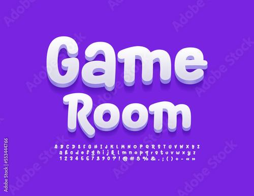 Vector funny emblem Game Room. Playful White 3D Font. Modern Alphabet Letters and Numbers set