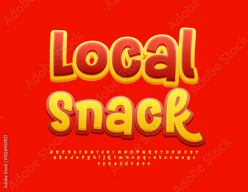 Vector funny label Local Snack. Yellow and Red Bright Font. Artistic Handwritten Alphabet Letters and Numbers set.