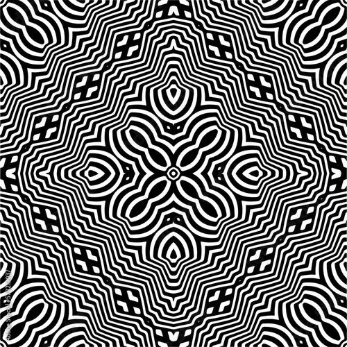Vector geometric seamless pattern. Minimal ornamental background with abstract shapes. Black and white mandala. Simple abstract ornament background. Dark repeat design for decor, fabric, cloth.